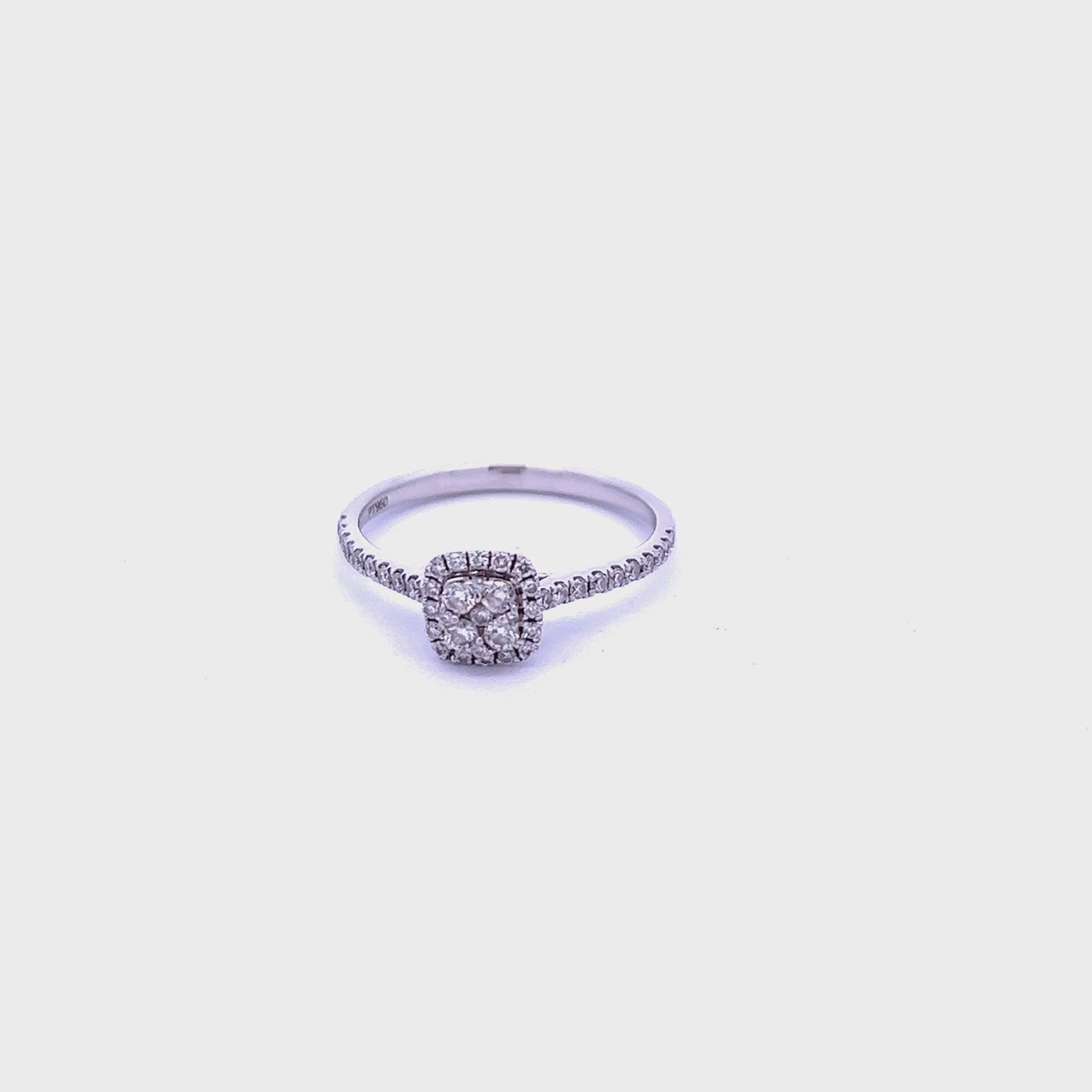 Platinum Ring with x9 Brilliant Cut Diamonds surrounded by x16 Brilliant Cut Diamonds and completed with a further x10 Brilliant Cut Diamonds on each shoulder.