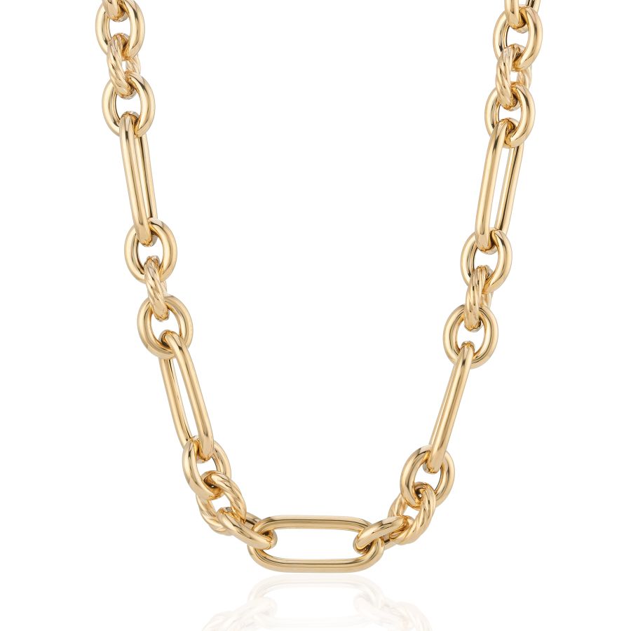 Oval links separated by smaller oval links with the middle one of these in a rope texture make up this beautiful chain necklace, fashioned in 9ct yellow gold.