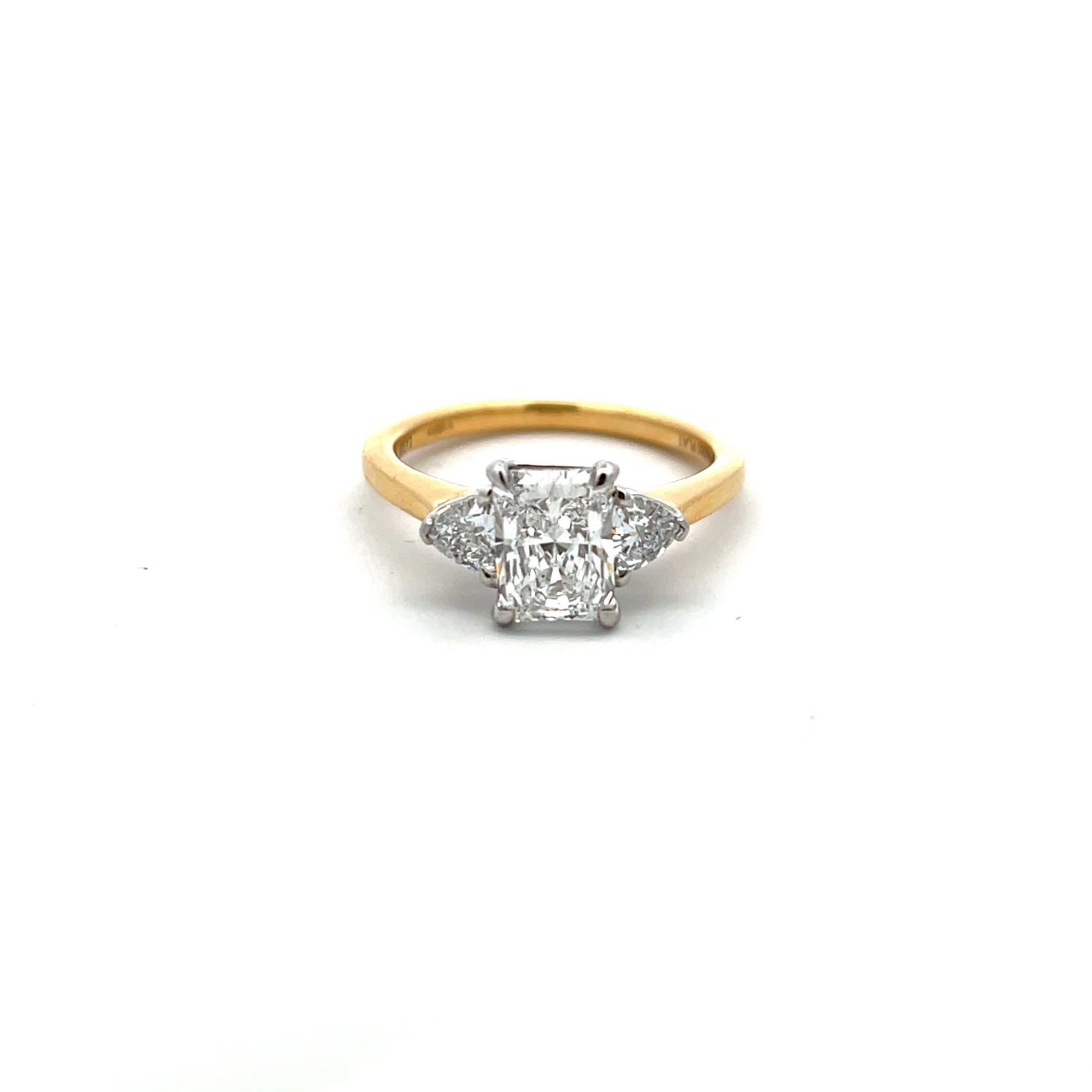 A radiant cut laboratory grown diamond centre stone with 2 trilliant cut laboratory grown diamonds, all in a platinum head to a 18ct yellow gold band.