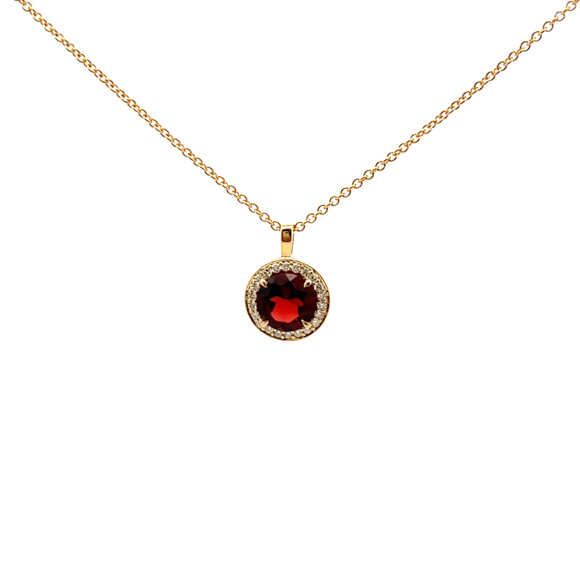 A 7mm round claw set, garnet surrounded by 22 brilliant cut diamonds, complete with 16-18" adjustable trace chain.