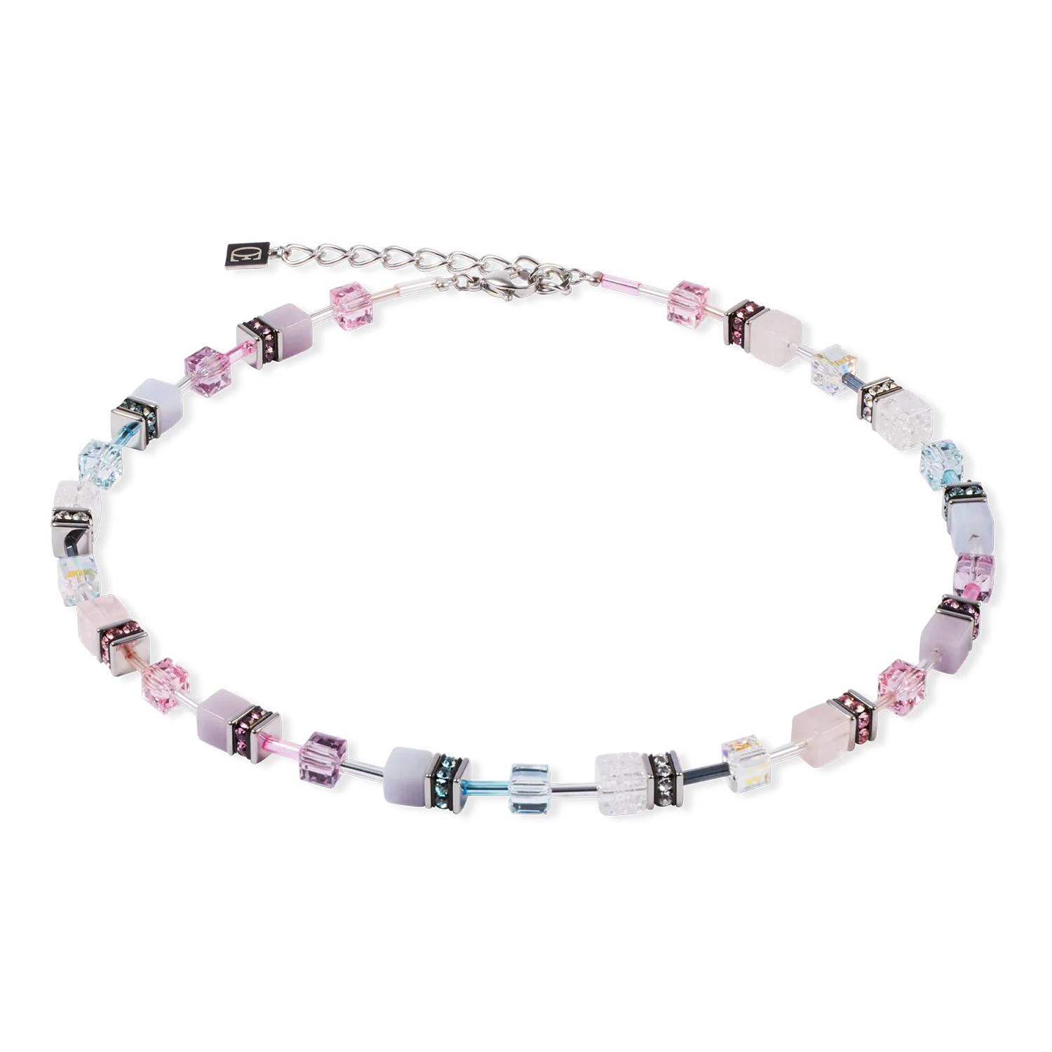 Soft pastel shades with a fascinating sparkle - the GeoCUBE® Iconic Precious necklace pink-lilac combines the delicate colours of chalcedony, rock crystal and rose quartz with precious crystal cubes. Fine details made of stainless steel in silver create a modern yet feminine look.