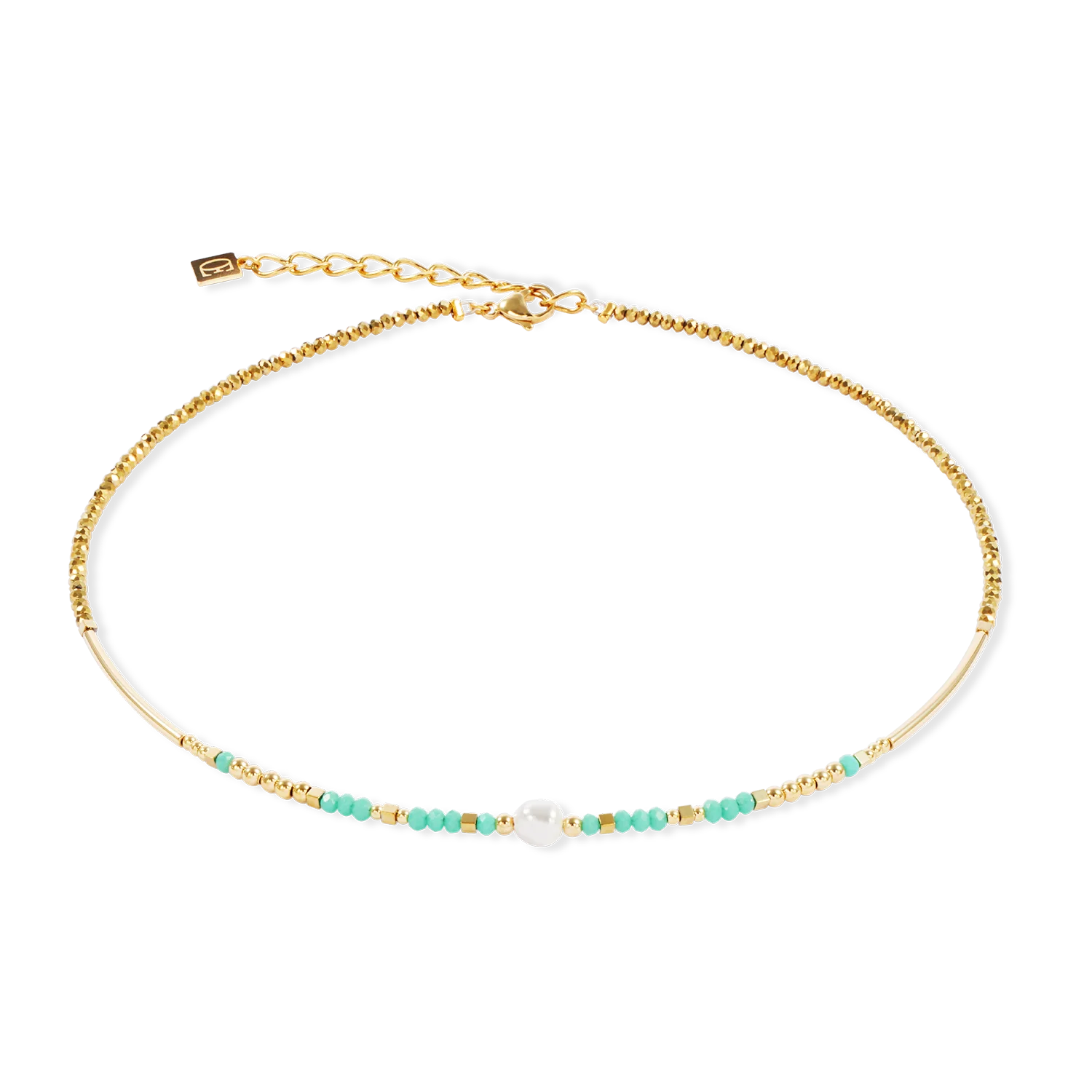 Fresh, soft, perfectly balanced - the Lagoon Pearl gold-mint necklace features a white Crystal Pearl in the centre, which creates a sophisticated look with its elegant shimmer. Flanked by mint-coloured glass beads and fine stainless steel spheres in gold, a harmonious interplay of cool and warm tones is created. A modern piece of jewellery with a summery lightness - perfect for every day or special occasions.