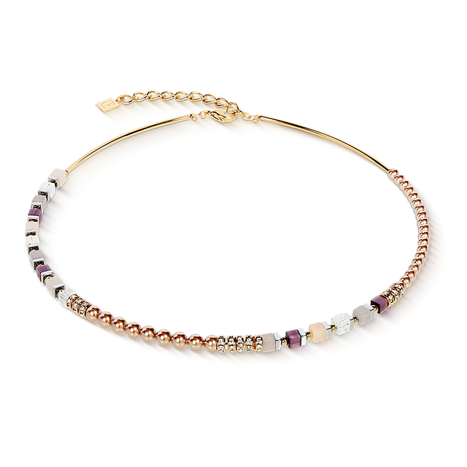 Bring glamour to the festive season with the Precious Fusion Offset Necklace in Champagne Blush! Warm champagne and rose tones meet shimmering Crystal Pearls sparkling crystals and the elegant shine of refined haematite. The design is complemented by smooth gemstone cubes made of pink Adventurine, agate and rock crystal, which lend structure and sophistication. This vibrant composition of colours and shapes makes the necklace the perfect companion for Christmas, New Year's Eve and all occasions when you want to shine.