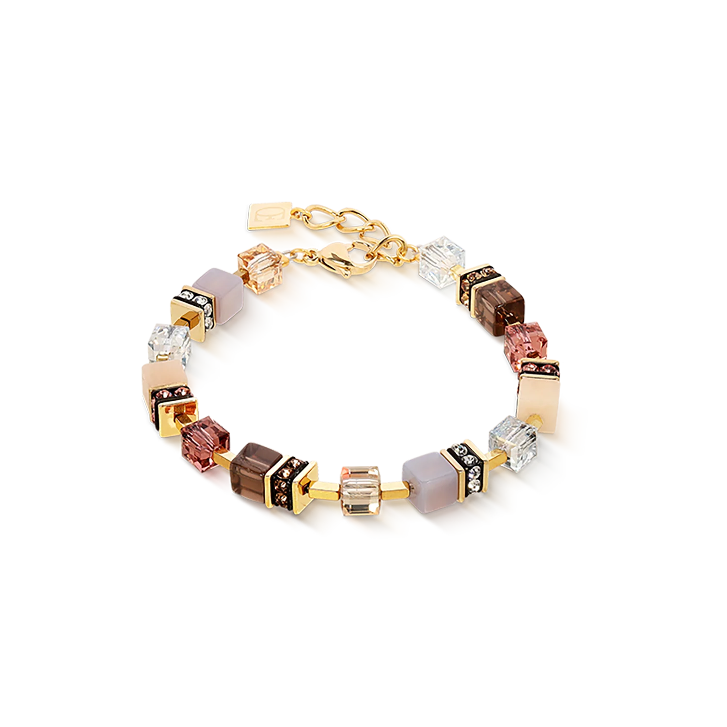 Fine natural tones and precise design come together: this bracelet plays with soft nuances of pink, cream, crystal clear and brown, combined in finely cut cube elements of Adventurine, smoky quartz, agate and crystals. Gold-coloured stainless steel details add a sophisticated finishing touch to the design. A stylish highlight - for festive outfits or as a gift with character.