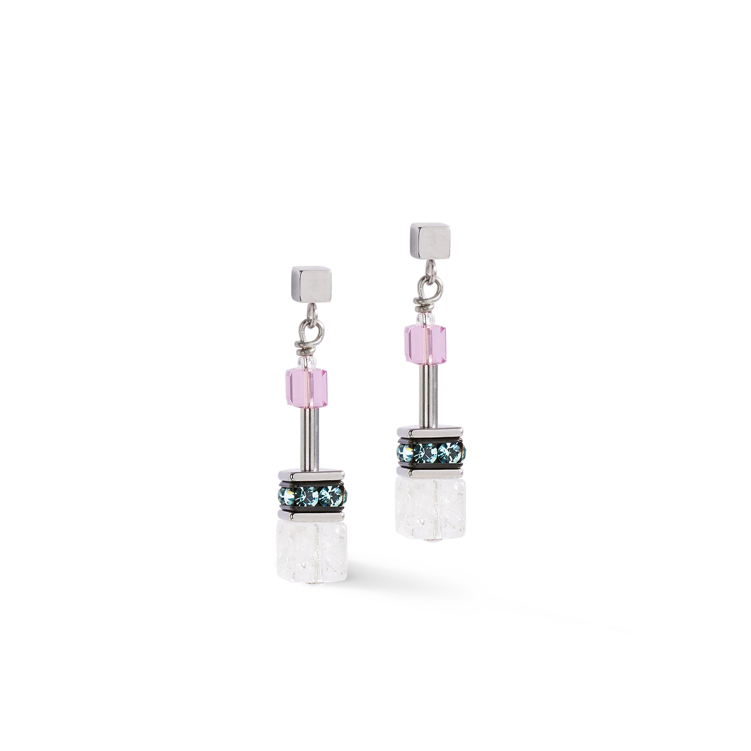 Delicate, feminine and classy - the GeoCUBE® Iconic Precious earrings pink-lilac focus on the soft nuances of chalcedony, rock crystal and rose quartz, complemented by sparkling Crystal cubes. The pastel colours have a harmonious and light effect, while stainless steel in silver lends a modern, clear elegance. Perfect for subtle but stylish accents.