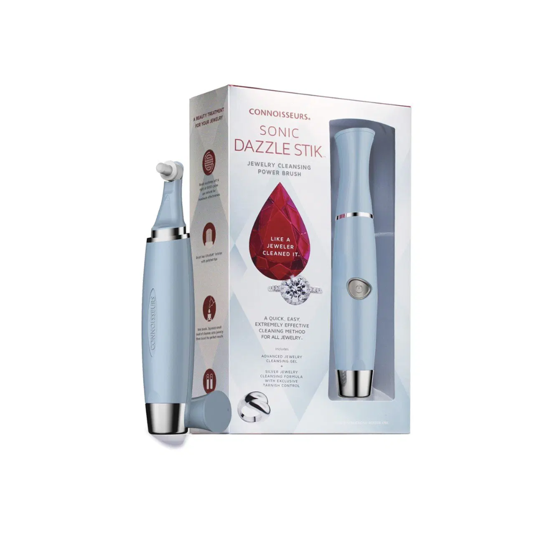 Connoisseurs Sonic Dazzle Stik is a breakthrough innovation in jewellery care. A quick, easy, and extremely effective cleaning method for all jewellery. Also includes a 30 ml. bottle of Advanced Jewellery Cleansing Gel and a 30 ml. bottle of Silver Jewellery Cleansing Crème. The Advanced Gel is perfect for gold, platinum, diamonds, delicate jewellery, precious and semi-precious stones. The Silver Crème cleans and polishes sterling silver, silver-plate, and silver with gemstones. The replaceable brush head oscillates left and right at 5,000 cycles per minute. Brush has UltraSoft® bristles with polished tips. The Silver Jewellery Cleansing Crème and Advanced Jewellery Cleansing Gel are non-toxic and has a pleasant scent. Sonic Dazzle Stik runs on 2 AAA batteries (included). Includes instruction manual.