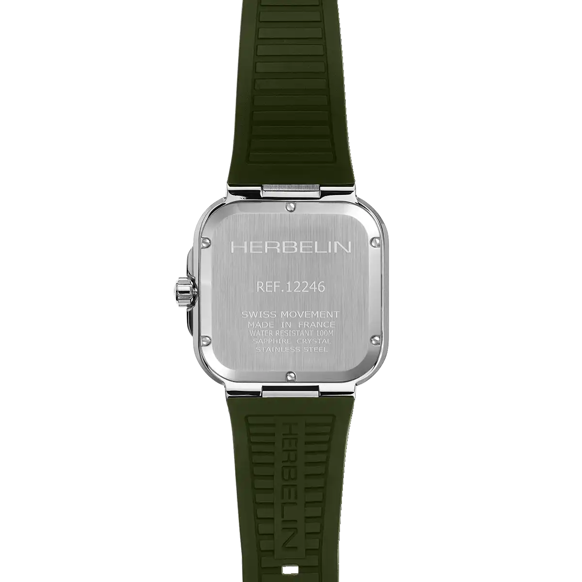 Resolutely assertive, the CAP CAMARAT SQUARE Quartz Khaki & FKM reveals a unique personality, shaped by the watchmaking rigor of the Maison HERBELIN. Its square silhouette, crafted in brushed steel, interacts with a khaki dial with a rare intensity. The ensemble composes a strong and very contemporary aesthetic.