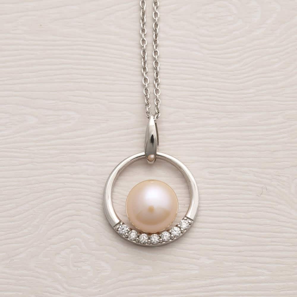 Jersey Pearl Circle White Freshwater Cultured Pearl Necklace with White Topaz