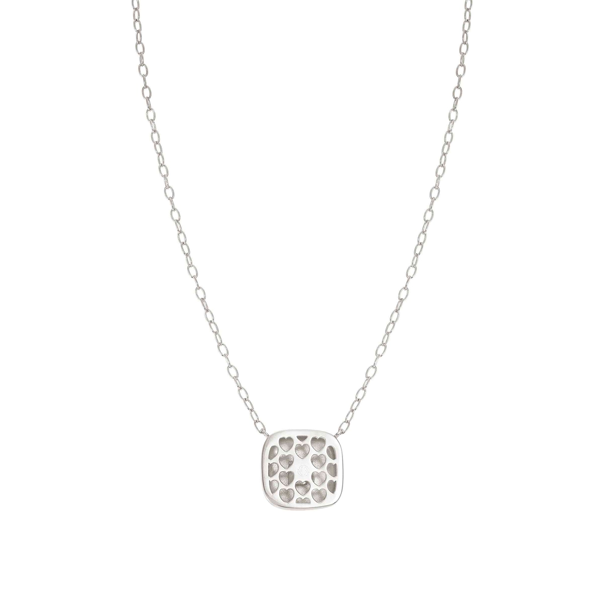 Sterling silver necklace with white rhodium treated finish and Square pendant with white Cubic Zirconia. Length: 46 cm, shortens to 42 cm. Pendant size: 1.5 x 1.5 cm.