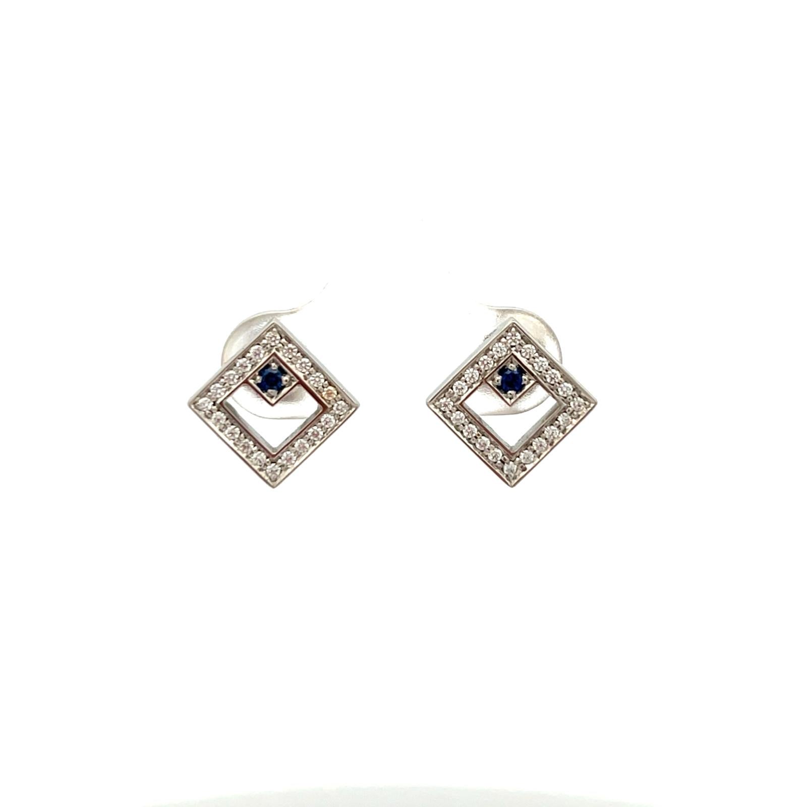 Each square stud earring has 20 brilliant cut diamonds and a single blue sapphire, all set in platinum.
