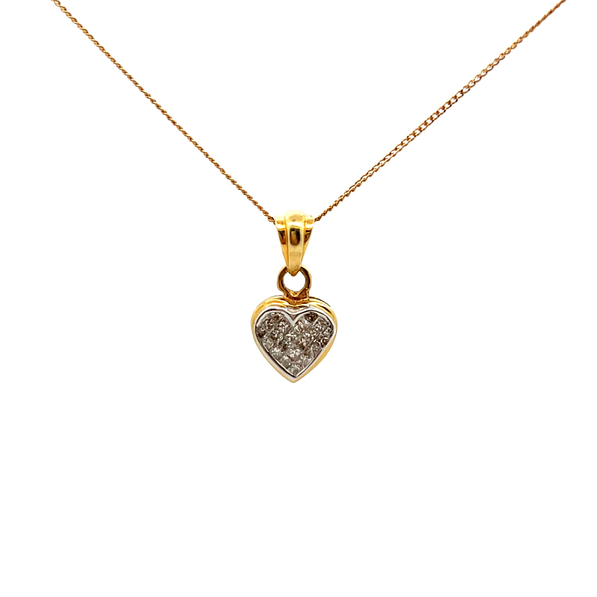 A heart shaped pendant set with 21 princess cut diamonds set in 18ct yellow gold complete with 18" fine flat yellow gold curb chain.