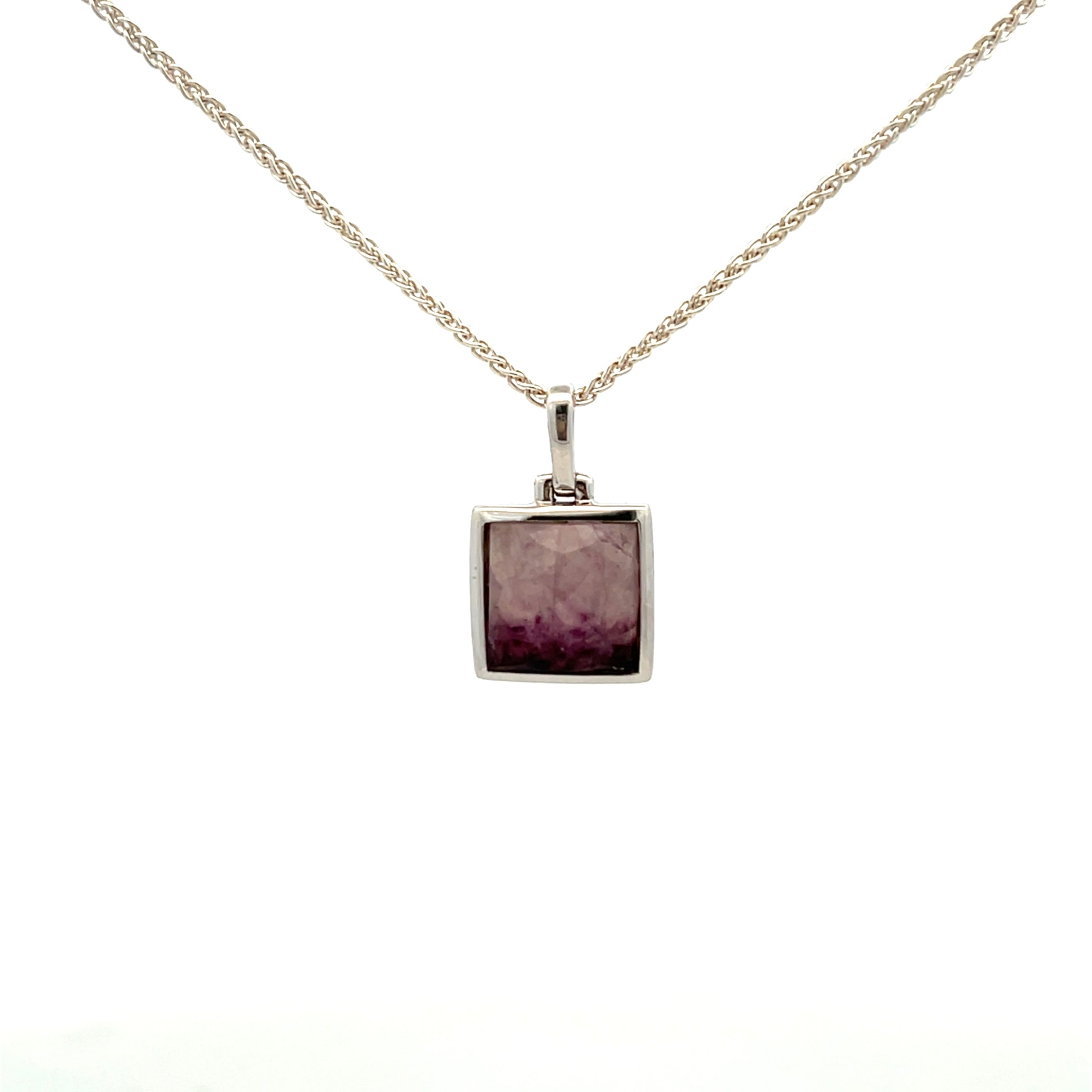 Approximately 13mm square unique facetted Derbyshire Blue John stone in a rubover setting complete with an adjustable Spiga chain.